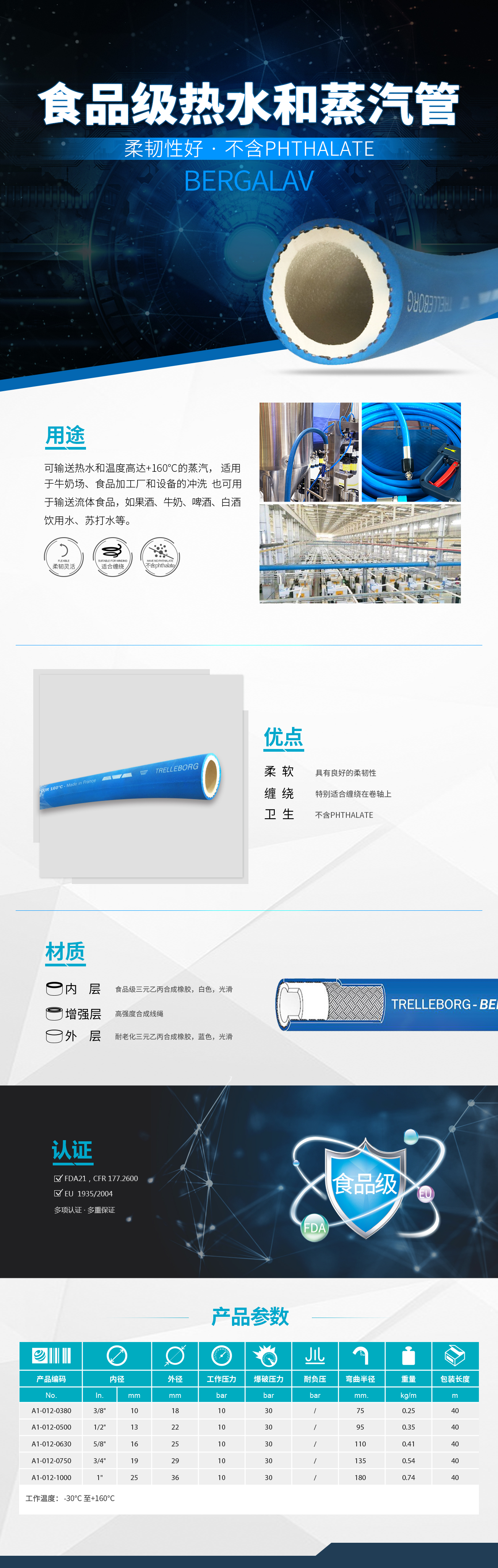 - 可輸送熱水和溫度高達(dá)+160°C的蒸汽,適用于牛奶場、食品加工廠和設(shè)備的沖洗 也可用于輸送流體食品,如果酒、牛奶、啤酒、白酒、飲用水、蘇打水等。