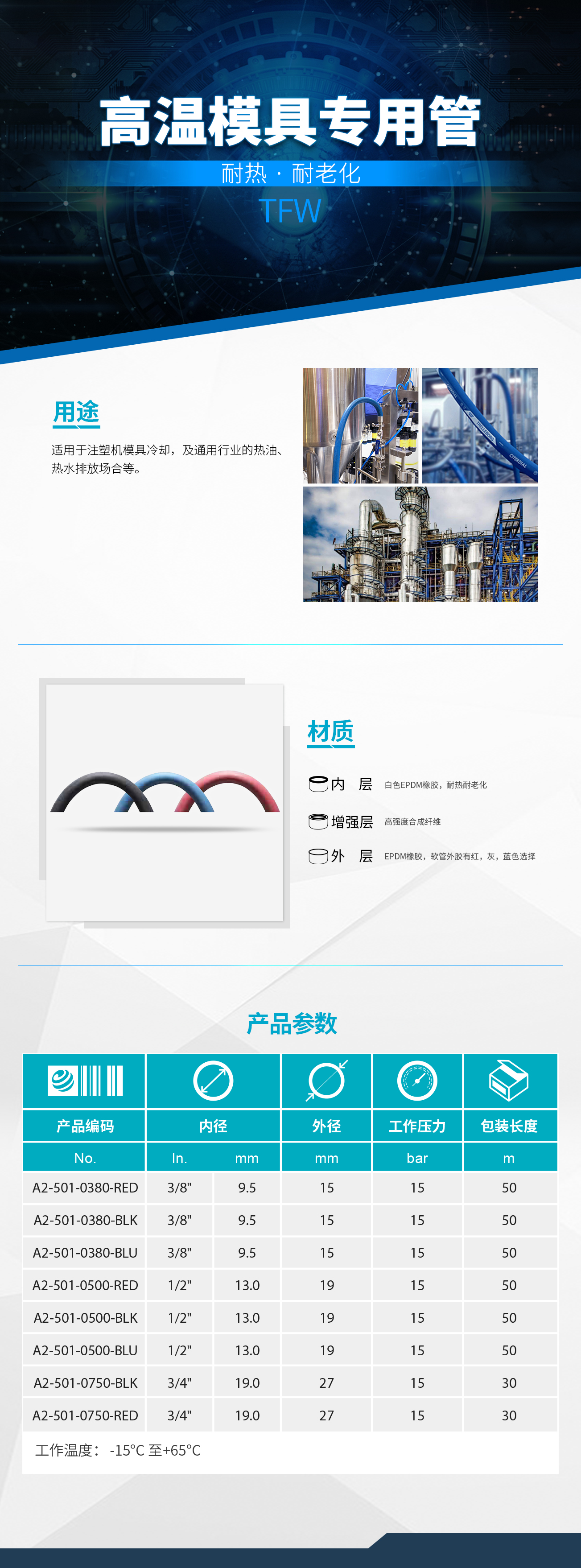 【外層】EPDM(三元乙丙)橡膠,軟管外膠有紅,黑,藍色選擇