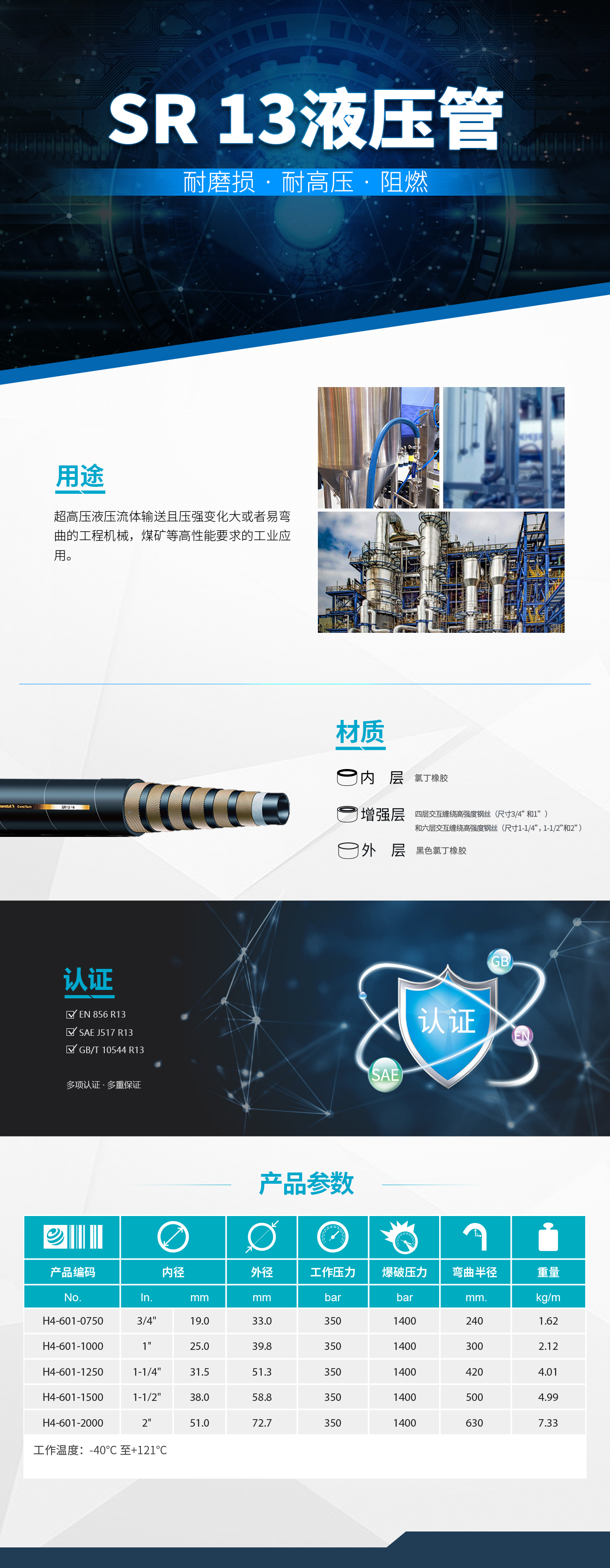 超高壓液壓流體輸送且壓強(qiáng)變化大或者易彎曲的工程機(jī)械,煤礦和性能要求的工業(yè)應(yīng)用。