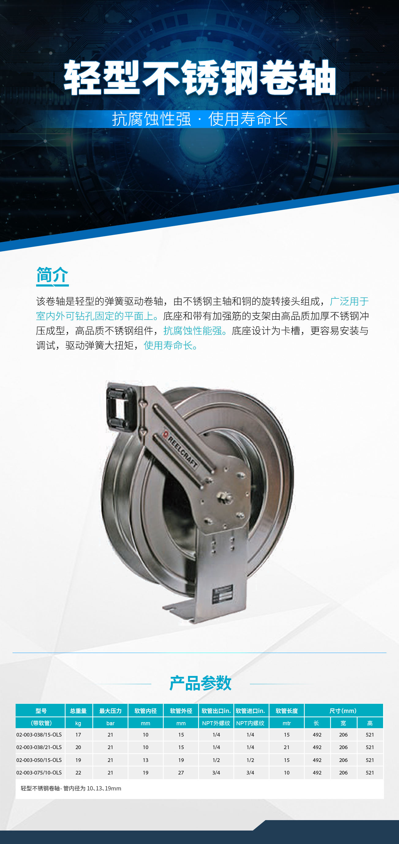 不銹鋼卷軸全部采用美國304級優(yōu)質(zhì)不 銹鋼制造而成,使用銳技抗腐蝕不銹鋼卷軸,將會延長用于輸送化學流體或用來清洗的軟管的壽命。通過合理的存放 不使用的軟管,可以減少由于軟管存放雜亂無序引起的絆倒事故,同時改善工作環(huán)境。不銹鋼卷軸使用范圍廣泛, 例如:食品生產(chǎn)、清洗,化學物質(zhì)的輸送,以及工業(yè)溶劑處理。同時不銹鋼卷軸還可應用在沿海和海上對抗腐蝕有苛刻要求的環(huán)境中。旋轉(zhuǎn)接頭使用 Viton“O”型圈。
