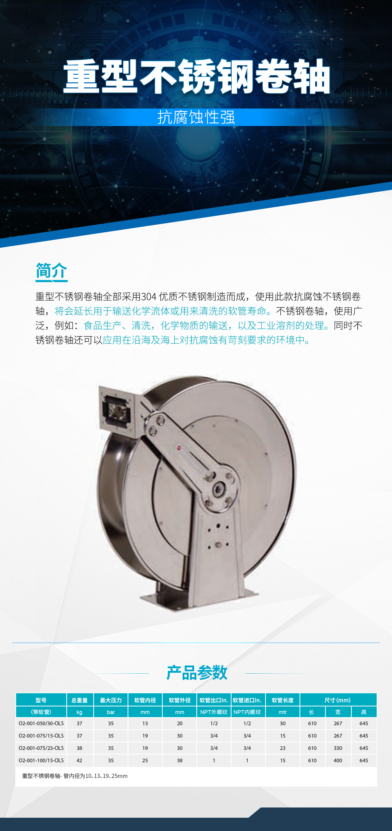 不銹鋼卷軸全部采用美國304級(jí)優(yōu)質(zhì)不 銹鋼制造而成,使用銳技抗腐蝕不銹鋼卷軸,將會(huì)延長用于輸送化學(xué)流體或用來清洗的軟管的壽命。通過合理的存放 不使用的軟管,可以減少由于軟管存放雜亂無序引起的絆倒事故,同時(shí)改善工作環(huán)境。不銹鋼卷軸使用范圍廣泛, 例如:食品生產(chǎn)、清洗,化學(xué)物質(zhì)的輸送,以及工業(yè)溶劑處理。同時(shí)不銹鋼卷軸還可應(yīng)用在沿海和海上對抗腐蝕有苛刻要求的環(huán)境中。旋轉(zhuǎn)接頭使用 Viton“O”型圈。