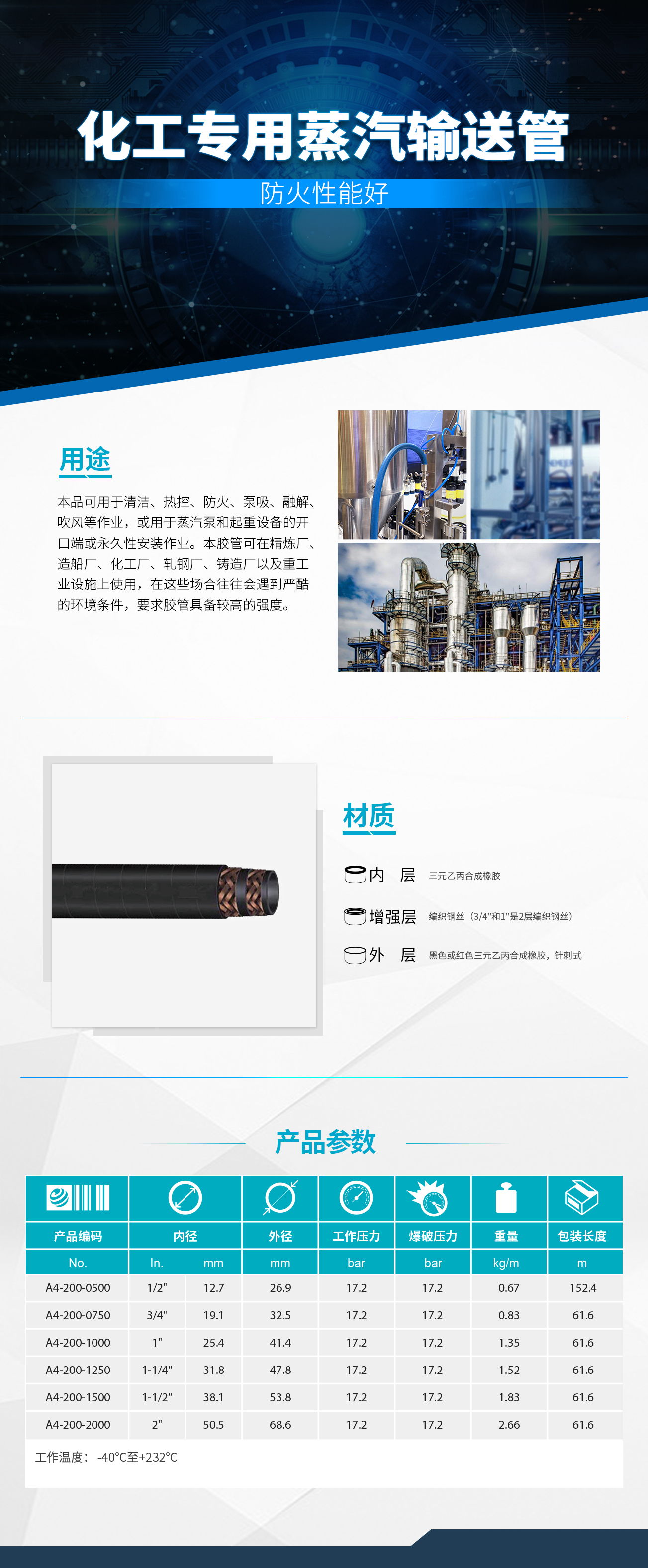 - 本品可用于清潔、熱控、防火、泵吸、融解、吹風等作業(yè),或用于蒸汽泵和起重設(shè)備的開口端或Permanent安裝作業(yè)。本膠管可在精煉廠、造船廠、化工廠、軋鋼廠、鑄造廠以及重工業(yè)設(shè)施上使用,在這些場合往往會遇到嚴酷的環(huán)境條件,要求膠管具備較高的強度。