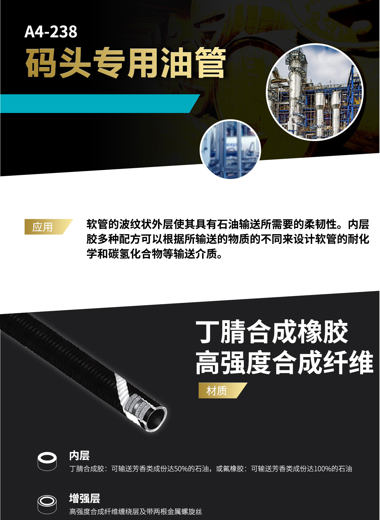 【內(nèi)層】Nitrile橡膠:可輸送芳香類成份達(dá)50%的石油,或氟橡膠:可輸送含芳香類物質(zhì)達(dá)100%的石油