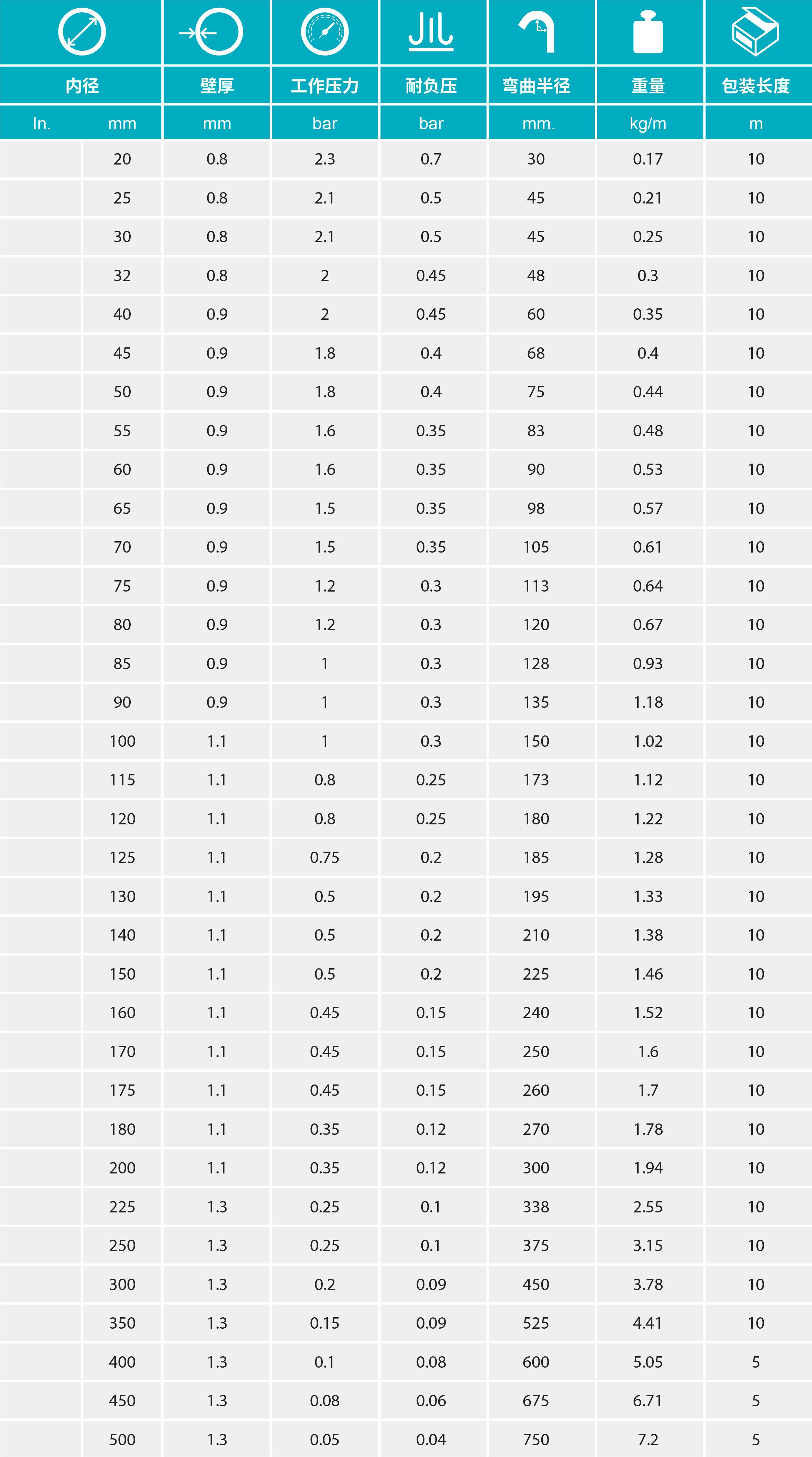 - 質(zhì)極輕且具有良好的柔韌性,內(nèi)壁平滑以保證物料在管內(nèi)流動(dòng)順暢