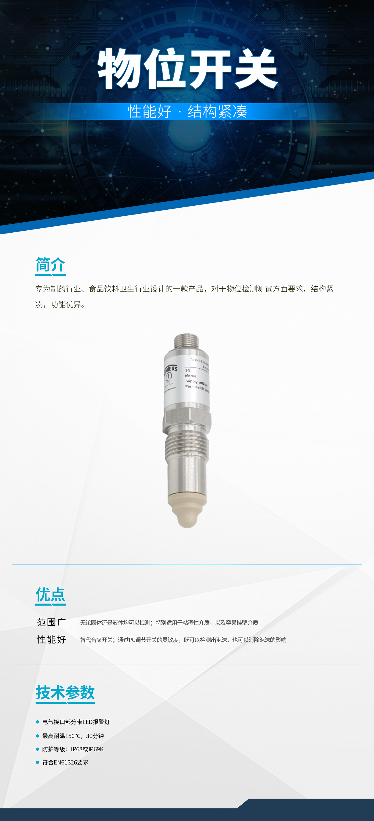 專為制藥行業(yè)、食品飲料衛(wèi)生行業(yè)設(shè)計的一款產(chǎn)品,對于物位檢測測試方面要求,結(jié)構(gòu)緊湊,功能優(yōu)異