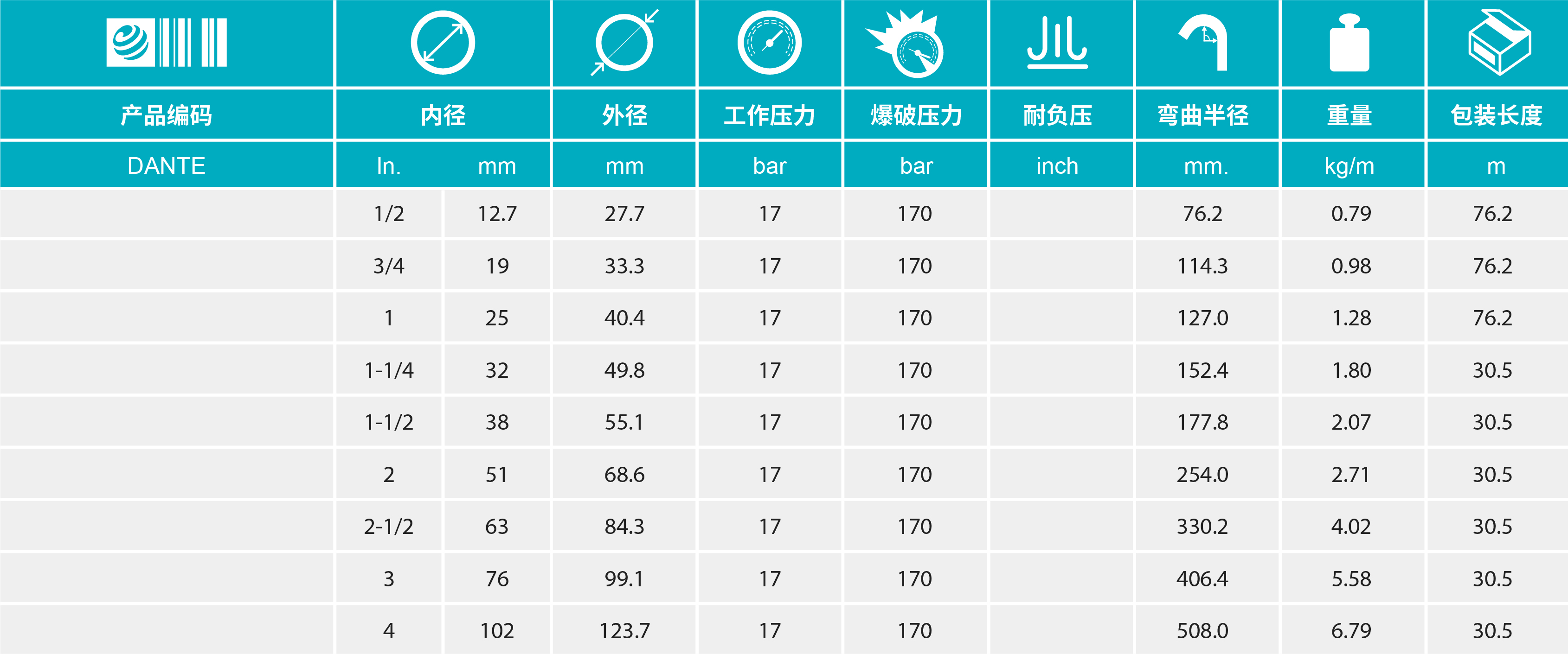 - 標(biāo)準(zhǔn)長度:1/2”, 3/4” 和 1”:76.2m; 其他尺寸長度:30.5m
