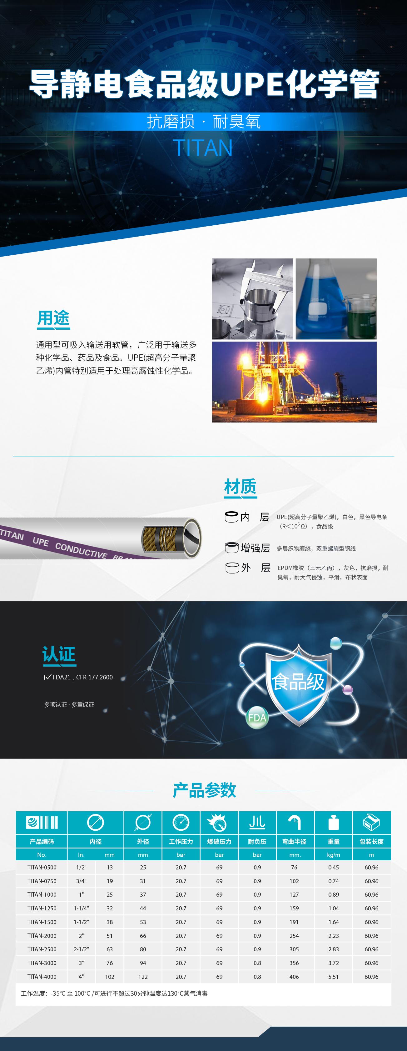 - 通用性可吸入輸送用軟管,廣泛應用輸送多種化學品、食品及藥品。內(nèi)層導電UPE(超高分子量聚乙烯)特別適用于輸送高腐蝕性化學品和防靜電需求應用場景。