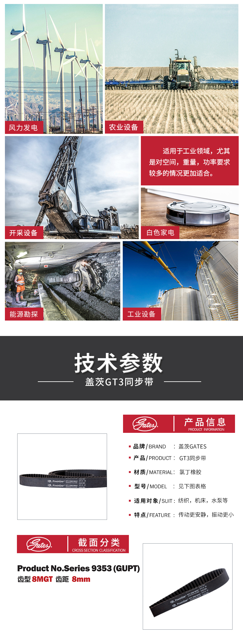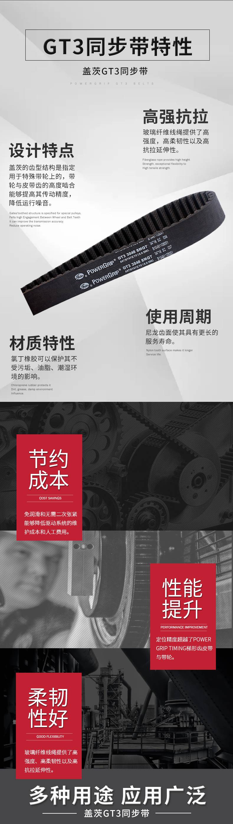 蓋茨的齒型結(jié)構(gòu)可和對應(yīng)帶輪匹配,帶輪和皮帶齒的高度嚙合能夠提高其傳動精度,降低運行噪音。