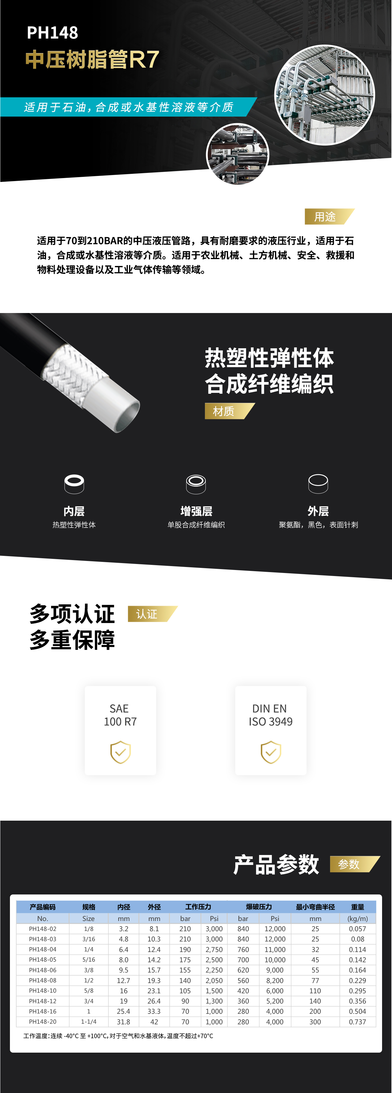- 適用于70到210bar的中壓液壓管路,具有耐磨要求的液壓行業(yè),適用于石油,合成或水基性溶液等介質(zhì)。適用于農(nóng)業(yè)機(jī)械、土方機(jī)械、安全、救援和物料處理設(shè)備以及工業(yè)氣體傳輸?shù)阮I(lǐng)域。