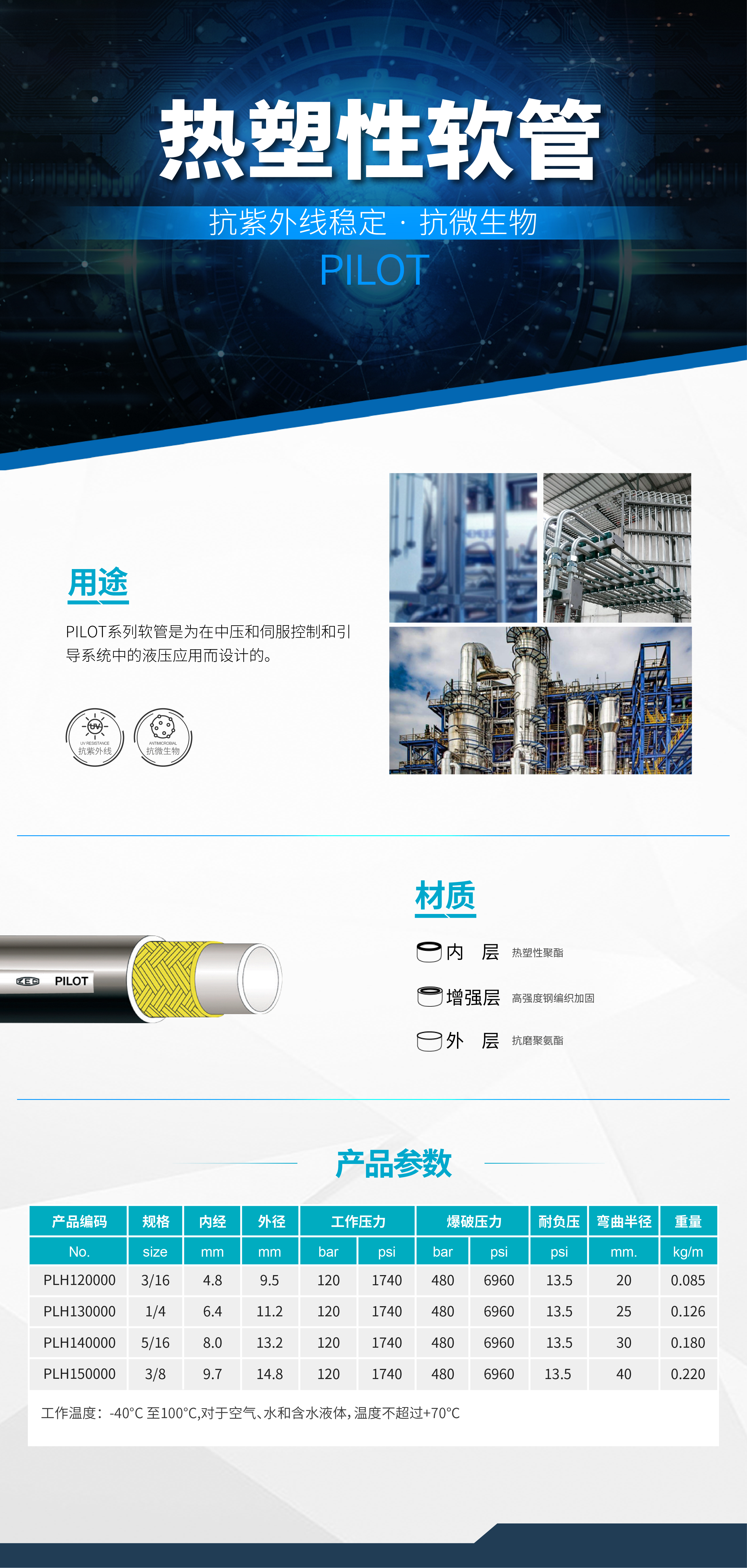 PILOT系列軟管是為在中壓和伺服控制和引導(dǎo)系統(tǒng)中的液壓應(yīng)用而設(shè)計的。