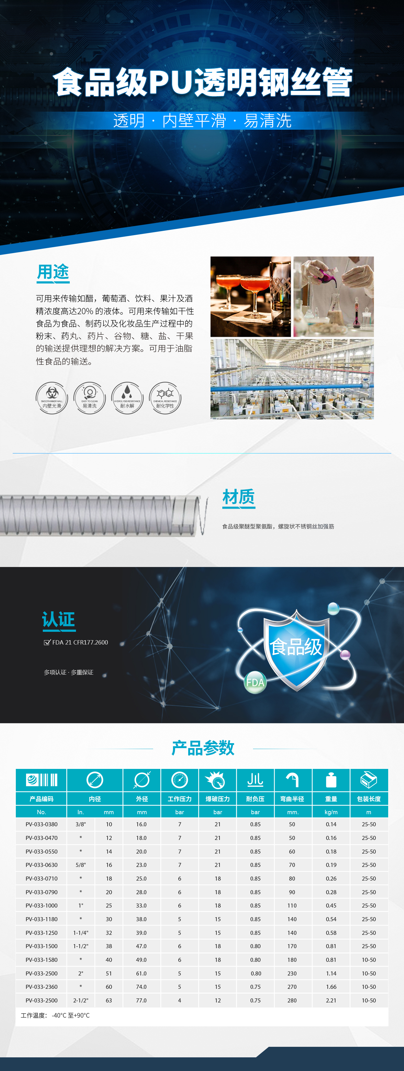 - 食品級聚醚型聚氨酯軟管,帶有螺旋狀不銹鋼絲加強(qiáng)筋