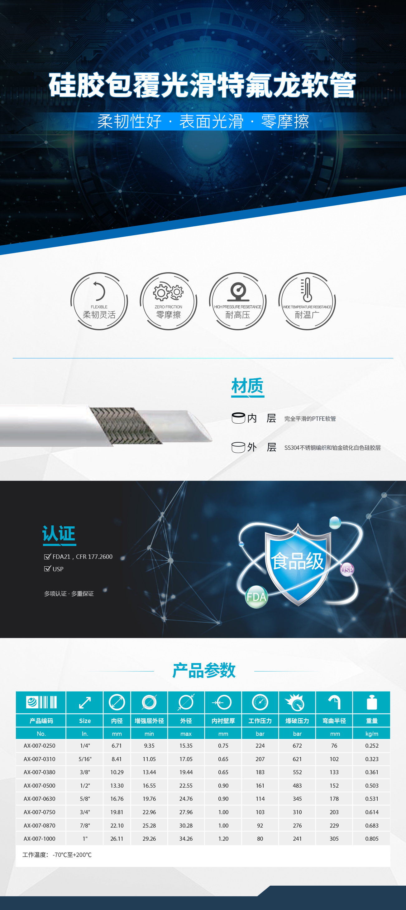 里層為平滑的PTFE軟管,外覆SS304不銹鋼編織和鉑金硫化白色硅膠層 高性能的產品,具有很好的柔韌性,表面光滑易擦洗,零摩擦,耐高壓和耐溫廣