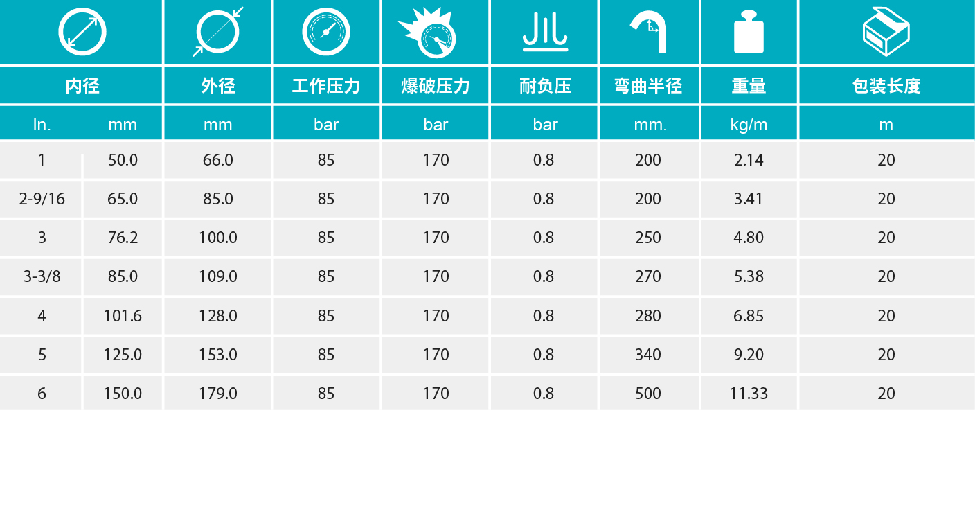 【增強(qiáng)層】ID=50mm 2層鋼絲纏繞,其他尺寸均為4層鋼絲纏繞