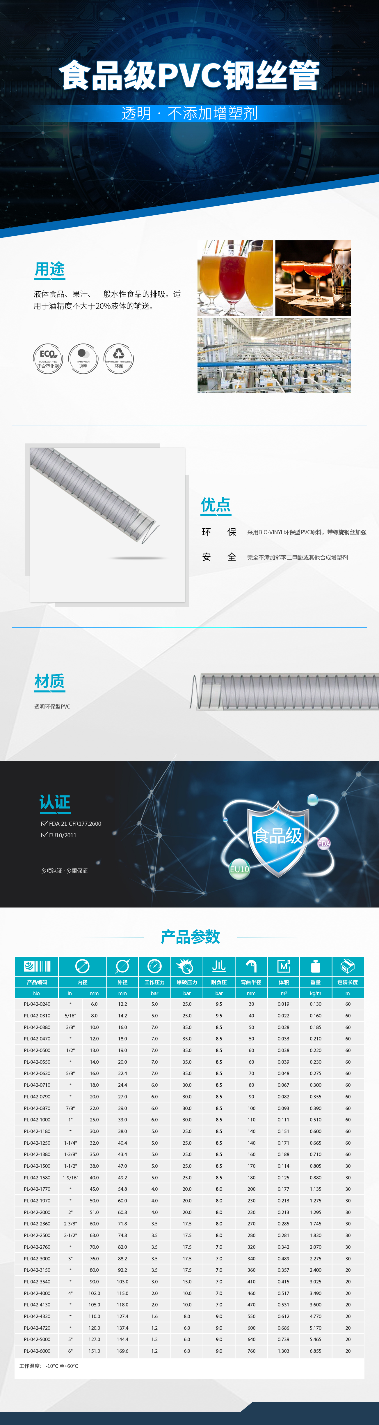 - 輸送軟管采用革命性的BIO-VINYL環(huán)保型PVC原料,帶螺旋鋼絲和高強(qiáng)度聚酯纖