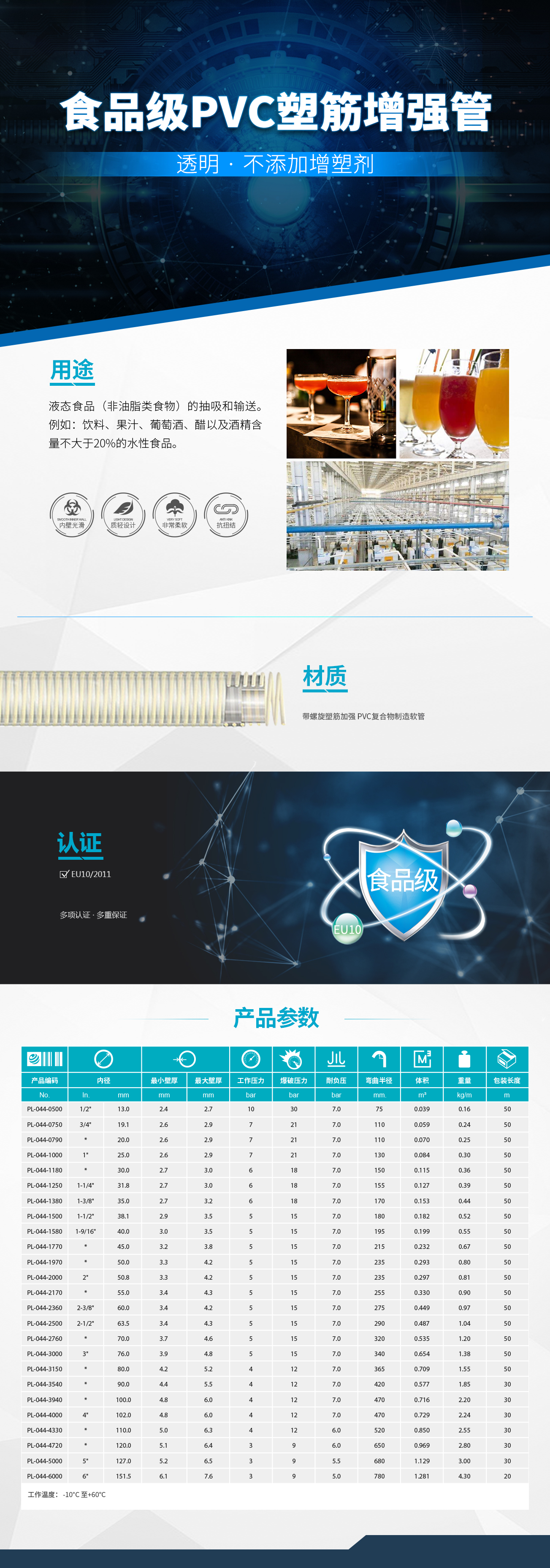 進口軟管液態(tài)食品(非油脂類食物)的抽吸和輸送。例如:飲料、果汁、葡萄酒、醋以及酒精含量不大于20%的水性食品。