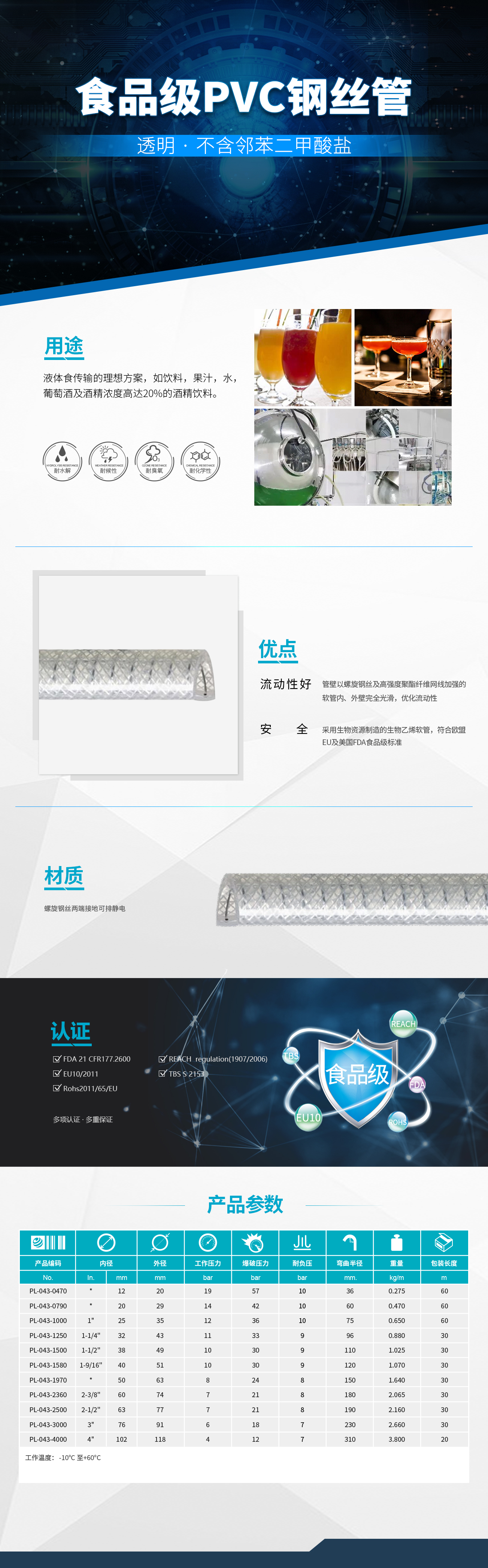 - 輸送軟管采用革命性的BIO-VINYL環(huán)保型PVC原料,帶螺旋鋼絲和高強(qiáng)度聚酯纖