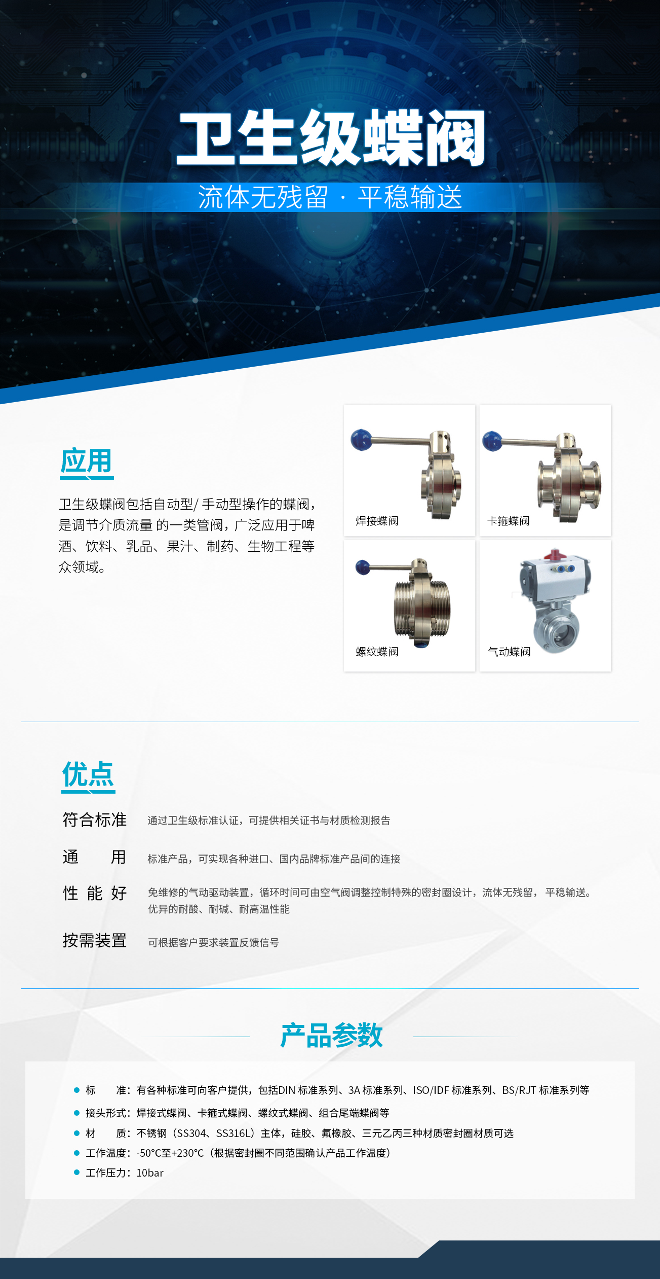 - 衛(wèi)生級(jí)蝶閥包括自動(dòng)型/手動(dòng)型操作的蝶閥,是調(diào)節(jié)介質(zhì)流量的一類(lèi)管閥,廣泛應(yīng)用于啤酒、飲料、乳品、果汁、制藥、生物工程等眾領(lǐng)域。