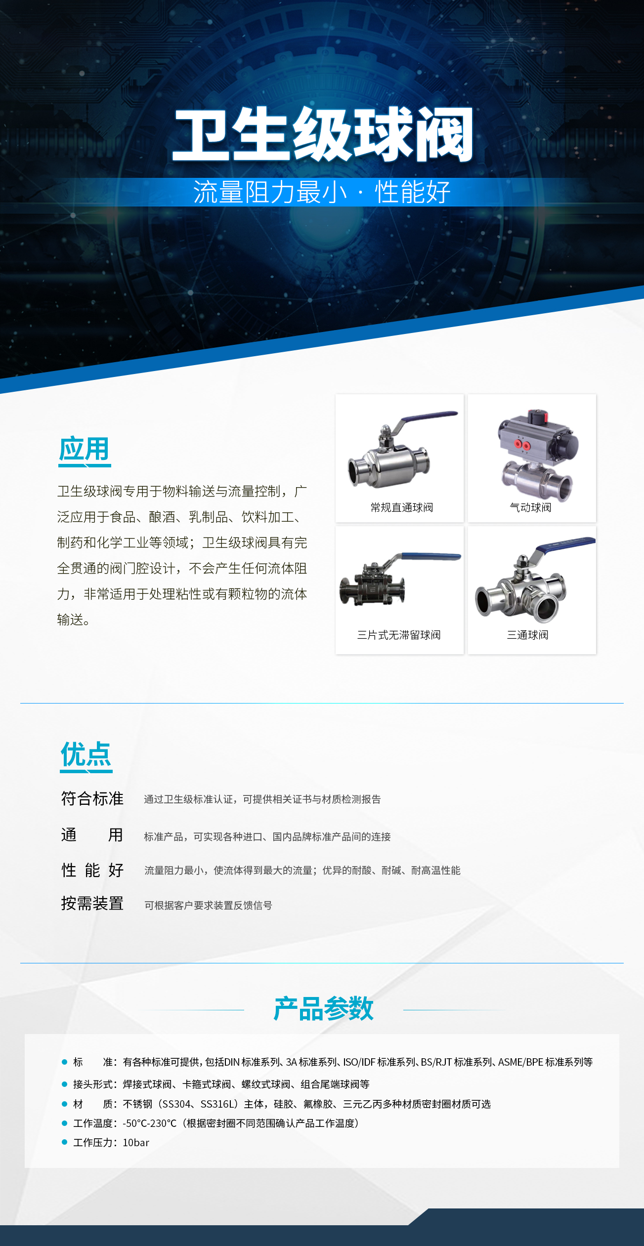 - 衛(wèi)生級(jí)球閥專用于物料輸送與流量控制,廣泛應(yīng)用于食品、釀酒、乳制品、飲料加工、制藥和化學(xué)工業(yè)等領(lǐng)域;衛(wèi)生級(jí)球閥具有貫通的閥門腔設(shè)計(jì),不會(huì)產(chǎn)生任何流體阻力,非常適用于處理粘性或有顆粒物的流體輸送。