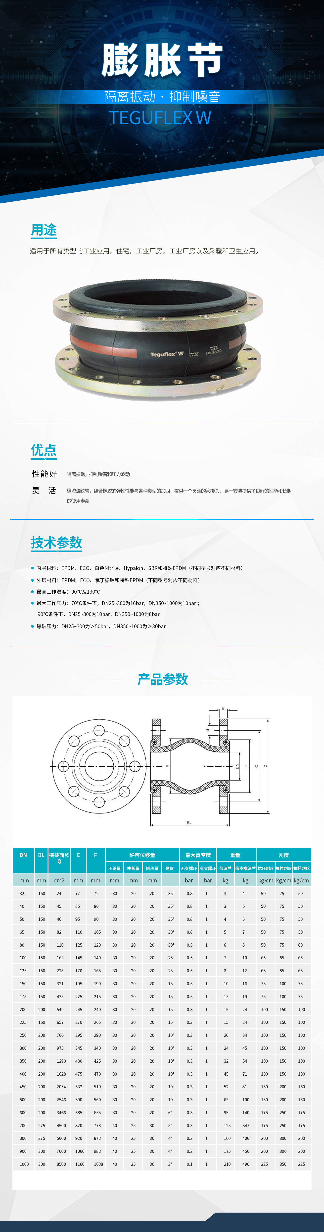 - 隔離振動(dòng),抑制噪音和壓力波動(dòng) 橡膠波紋管,結(jié)合橡膠的彈性性能與各種類型的加固,提供一個(gè)靈活的管接頭,易于安裝提供了良好的性能和長期的使用壽命
