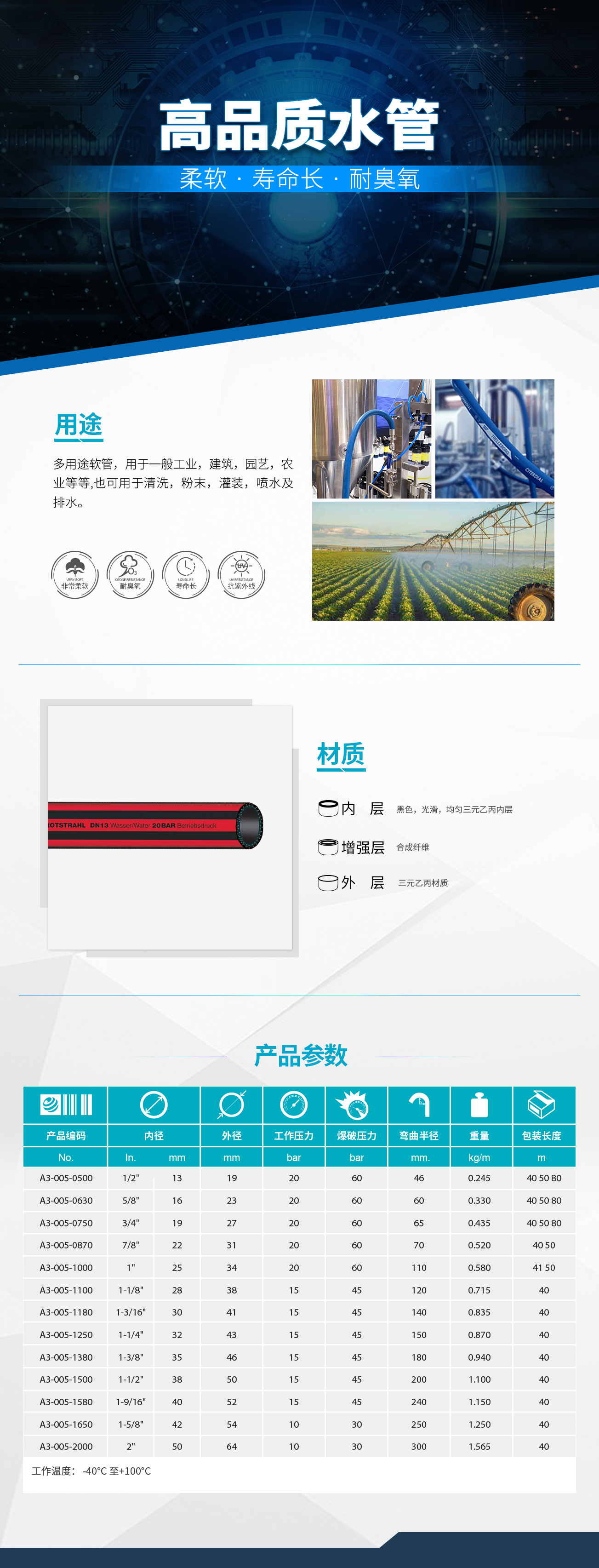 - TRIX ROTSTRAHL 是一款多用途軟管,用于一般工業(yè),建筑,園藝,農業(yè)等等。 軟管非常柔軟,耐臭氧,環(huán)境,操作溫度可從-40℃至+100℃。 該軟管也可用于清洗,粉末,灌裝,噴水及排水。
