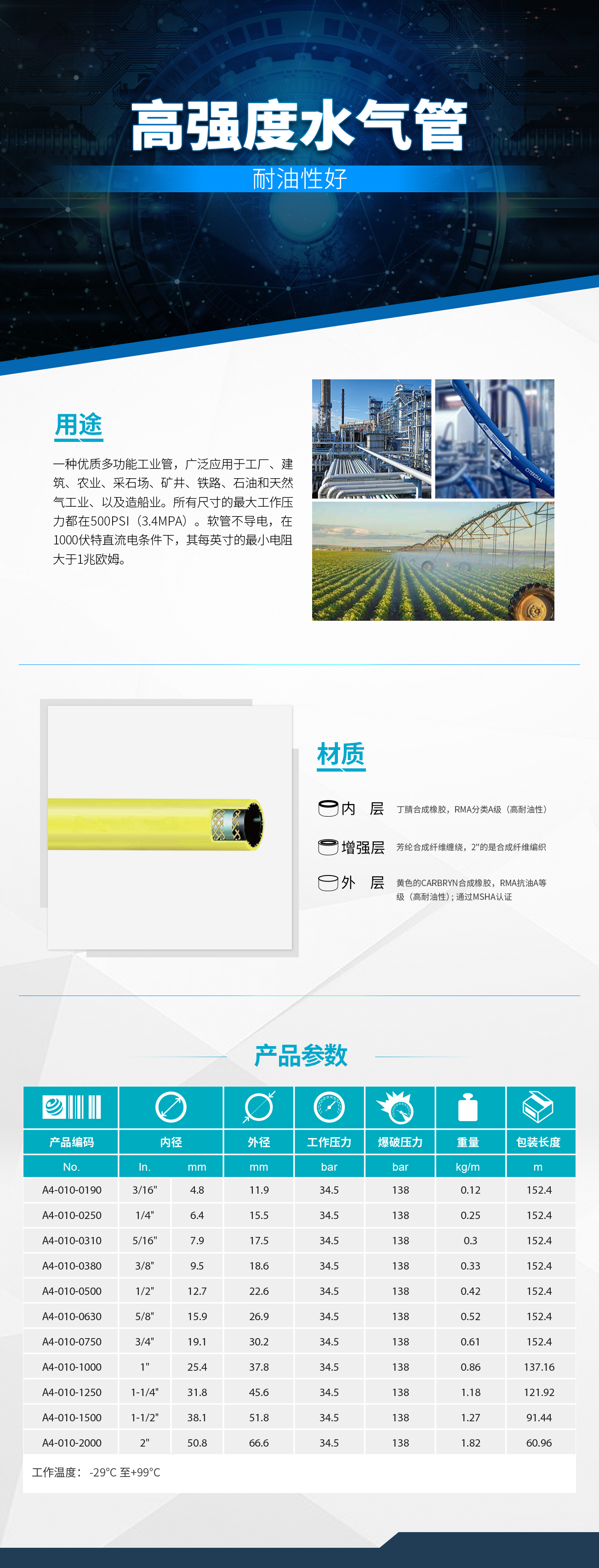 - 一種優(yōu)質多功能工業(yè)管,廣泛應用于工廠、建筑、農業(yè)、采石場、礦井、鐵路、石油和天然氣工業(yè)、以及造船業(yè)。所有尺寸的工作壓力都在500psi(3.4Mpa)。軟管不導電,在1000伏特直流電條件下,其每英寸的電阻大于1兆歐姆。