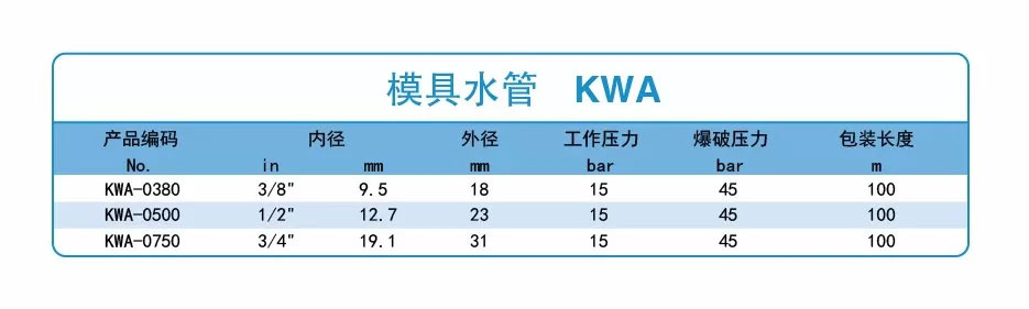 在此小編為大家推薦一款模具水管——KWA,該產(chǎn)品專為模具行業(yè)設(shè)計(jì),具有長(zhǎng)時(shí)間耐高溫(95-150℃)特性、良好的彎曲半徑(適應(yīng)安裝空間)、好的抗老化能力并且其規(guī)格可滿足多數(shù)模具冷卻系統(tǒng)的孔徑及水量要求。