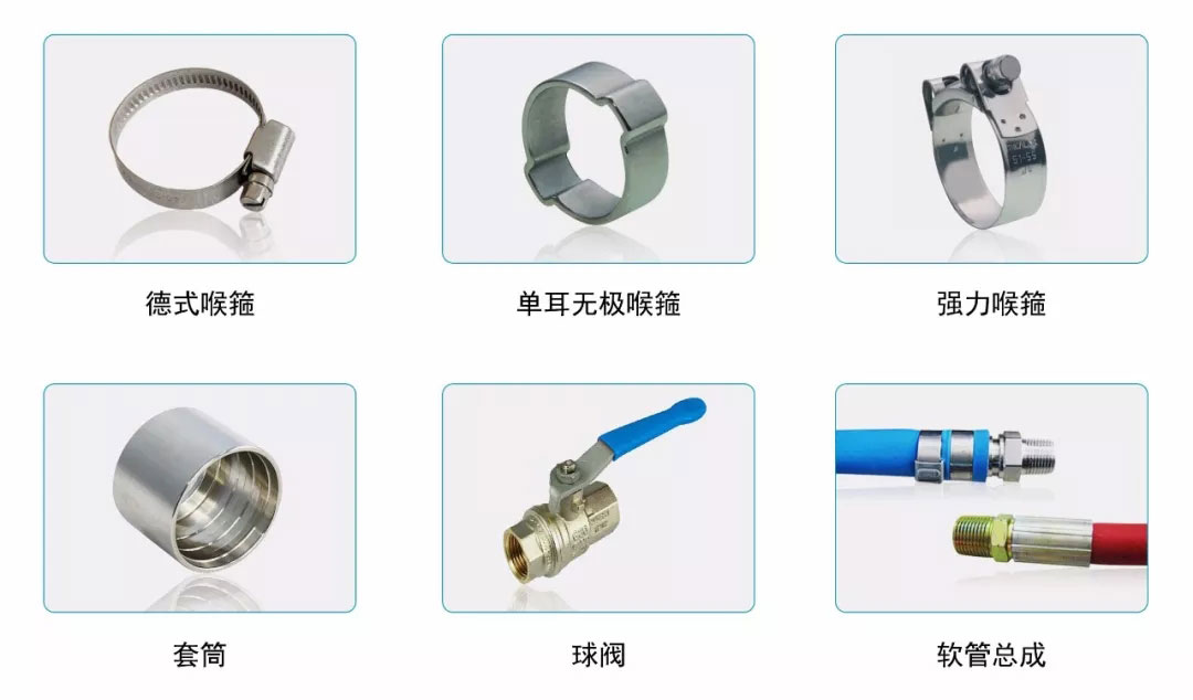 有了好的軟管和接頭,剩下的就是將它們緊固連接了。依然放心的交給我們吧,我們提供全面的接頭緊固方案,無(wú)論是喉箍、卡箍、扣壓、扎帶、兩片式卡箍緊固,均有安全可靠的產(chǎn)品方案提供。