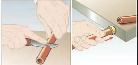 接頭首節(jié)進(jìn)入軟管后,把接頭放到平整位置上,用力將軟管末端推到底部,直到端面全部吞并到塑料蓋內(nèi)。