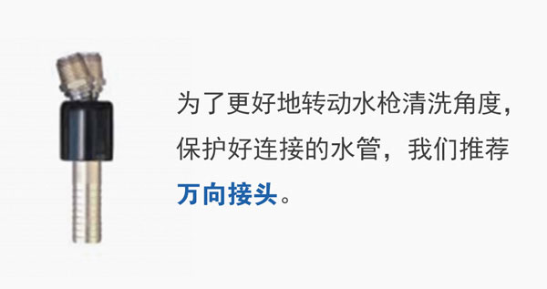 除此之外,針對設(shè)備外部及工作場合的清洗,比如在食品加工廠、糧油車間的糖分和油脂清洗,罐頭廠、屠宰廠、水產(chǎn)品市場的設(shè)備和地面清洗,周轉(zhuǎn)罐周轉(zhuǎn)槽的清洗,我們就需要另外的清洗方式。我們推薦的比較完善的方案是,蒸汽冷水混合器或者熱水冷水混合器+食品級(jí)清洗軟管+自動(dòng)收納的卷管器+清洗水槍,高效、節(jié)能,且規(guī)范。