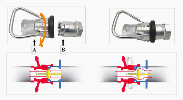 將母頭端(圖示 A)對(duì)準(zhǔn)公頭端(圖示 B)順時(shí)針旋轉(zhuǎn) 15°連接在一起,此時(shí),閥門還是關(guān)閉的。繼續(xù)順時(shí)針旋轉(zhuǎn) 90°才能打開閥門,產(chǎn)品開始流通。關(guān)閉閥門和打開接頭,采用以上相反的步驟。