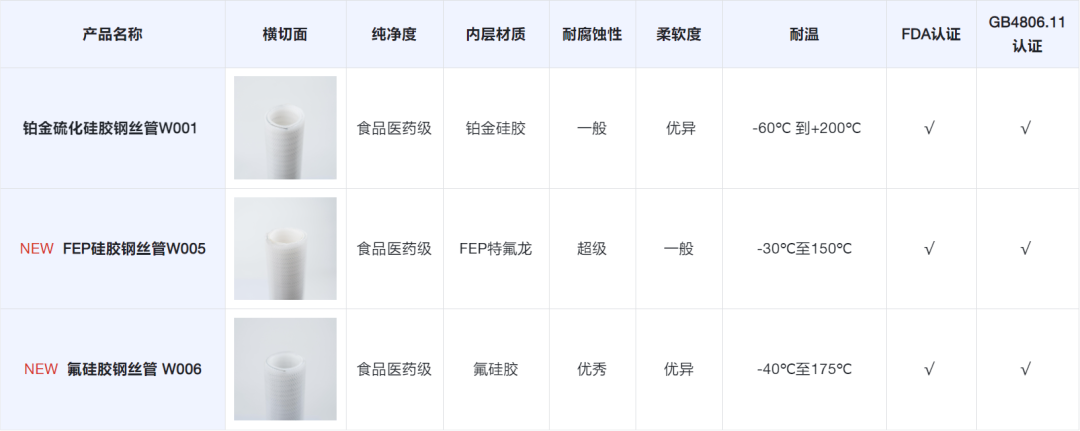 內(nèi)層采用了未藍(lán)新開發(fā)的高品質(zhì)FEP/氟硅膠,以滿足不同生產(chǎn)環(huán)境下的流體傳輸需求,為食品、醫(yī)藥行業(yè)提供更多樣的選擇。