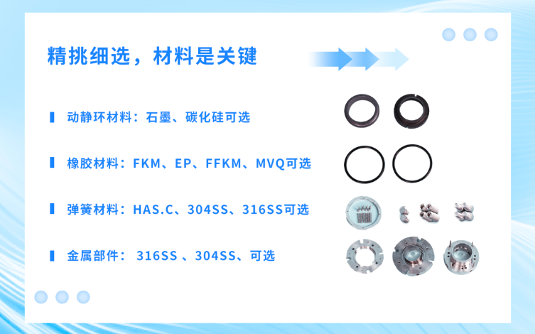 優(yōu)質(zhì)密封圈材料如碳化硅、石墨等,具有優(yōu)異的耐磨、耐腐蝕和抗高溫性;金屬部件選用高強度、耐腐蝕的合金鋼或不銹鋼;彈簧材料選用高彈性、耐腐蝕及抗高溫的不銹鋼。甄選品質(zhì),值得信賴。